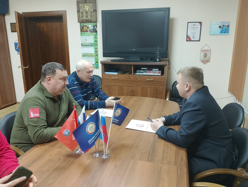 В Региональном отделении ДОСААФ России Смоленской области состоялась встреча и.о. председателя Регионального отделения ДОСААФ России Смоленской области Владимира Толпыго с начальником регионального штаба Смоленского регионального отделения «Волонтерская рота боевого братства» Павлом Семеновым, на которой обсуждалась совместная работа по вопросам взаимодействия в сфере военно-патриотического воспитания, проведение совместных образовательных и просветительских мероприятий.